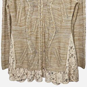 Boho Lace Trim Knit Cardigan Sweater Size M Beige Open Front Cozy Fall Layering