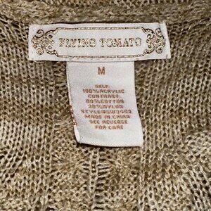 Elevate your fall wardrobe with this Flying Tomato open front knit cardigan in heather beige. Featuring a soft acrylic blend and romantic lace trim, this boho-chic sweater blends cozy luxe with cottagecore charm. The draped silhouette and neutral tone make it a versatile layering piece for transitional weather, perfect for casual outings, workwear, or festival style. Size Medium. Gently worn, excellent condition. Style SWTK0002.