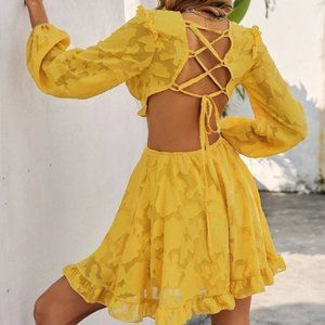 Yellow Lace tie Backless Mini Dress with bishop sleeves