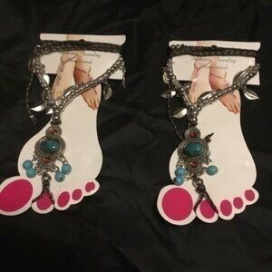Boho Lace up Rope Handmade Toe Ring Red Blue Stone Anklet With leaves