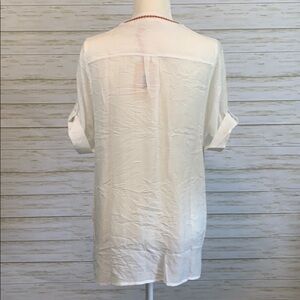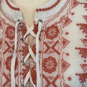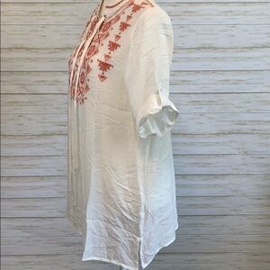 Boho Lace-up embroidered front tunic top. Lightweight white rayon polyester blend. Blush colored embroidery around the neckline. Women’s size Medium. New with tags, never worn.