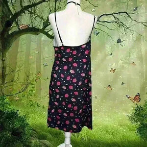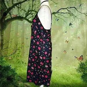 Boho lati fashikn strawberry print navy blue two piece slip dress & robe, robe comes with a matching strawberry print belt, the slip dress has cute black lace detailing, low v-neckline, adjustable shoulder straps, super soft and comfortable material. Brand: Lati Fashion