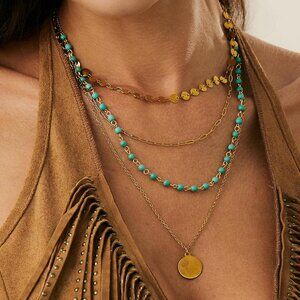 Elevate your style with this stunning layered gold necklace set featuring a captivating turquoise and coin pendant design. Perfect for country concerts, beach outings, or any casual-chic occasion, this versatile jewelry set adds a bold bohemian touch to any outfit. The multi-strand arrangement creates an eye-catching layered effect that draws attention while maintaining an effortlessly fashionable look. The western-inspired elements blend seamlessly with modern fashion sensibilities, making it an ideal accessory for both day and evening wear. The combination of gold-toned chains and turquoise accents creates a striking contrast that complements a wide range of styles and colors. Whether you're gifting it to a fashion-forward friend or treating yourself, this necklace set is sure to become a cherished addition to any jewelry collection. The varying chain lengths allow for a customized appearance, while the coin pendant adds a unique vintage-inspired charm to complete the boho-western aesthetic.