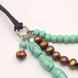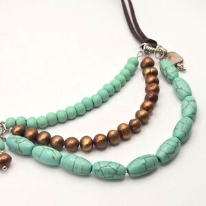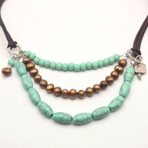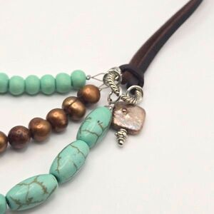 Earthy and eclectic, this boho-inspired layered necklace features three strands of beads: turquoise-colored howlite, bronze-tone freshwater pearls, and matte wood rounds. Strung on rich brown leather cord with silver-tone accents and a coin pearl charm. Adjustable from 20" to 22" inches with lobster clasp and extender. Great for layering or making a statement on its own.