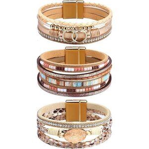 Discover our set of three leather bracelet wraps, showcasing a captivating mix of crystal beads, multi-layer designs, and resin stone accents. Perfect for any occasion—whether shopping, working, partying, dancing, or going on dates—these bracelets are designed to turn heads and garner compliments.