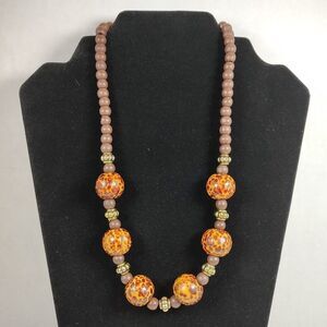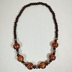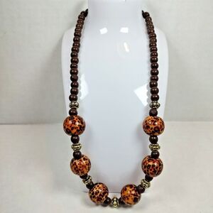 Boho Leopard Print Beaded Necklace Gold Tone Faux Wood Tribal Statement 19"