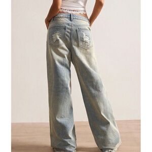 Boho Light Wash Floral Embroidered Distressed Straight leg Denim Jeans
