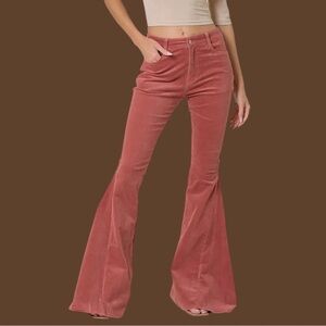 Mauve corduroy bell bottoms feature a high-waisted fit and a dramatic flare from the knee down giving retro-inspired. These have a raw hem with a stitch and they have stretch. Great for a boho chic look!