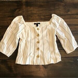 Boho Linen Square Neck Puff Sleeve Pin Striped Cropped Top Women’s Small Cream