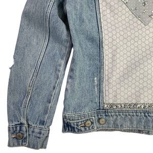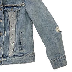 This blue gray denim jean jacket has a stylish boho sparkle effect, perfect for adding a touch of casual glamour to any outfit. The classic trucker style and relaxed fit make it a comfortable and versatile piece that can be dressed up or down. With a small size, this jean jacket is ideal for petite women looking to elevate their boho-inspired looks.