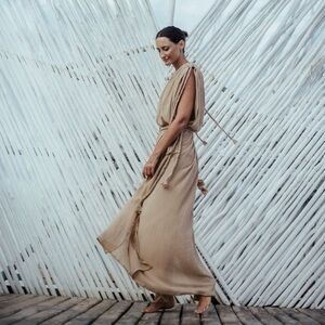 Effortless elegance defines this stunning maxi dress, a vision of relaxed sophistication. The deep V-neckline adds a touch of allure, while the sleeveless design keeps it breezy and perfect for warm weather. A cinched waist creates a flattering silhouette, flowing into a long, graceful skirt with side slits for easy movement. The overall effect is both comfortable and chic, making it a versatile piece for your wardrobe. Imagine yourself wearing this dress to a beachside brunch, a casual summer wedding, or a sunset cocktail party.