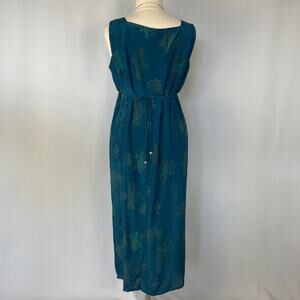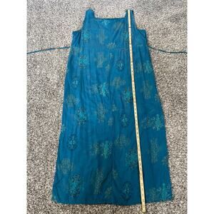 Boho Maxi Dress Plus Size 1X Blue Brocade Print Pure Silk Sleeveless Hippie Vtg