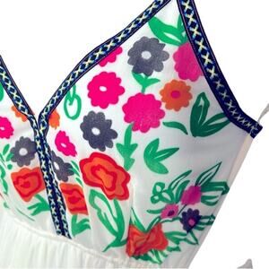 Designed with beautiful multicolor embroidery-style prints in white, pink, green, orange, and black, the dress offers a romantic, free-spirited vibe — perfect for festivals, beach weddings, vacations, or summer date nights.