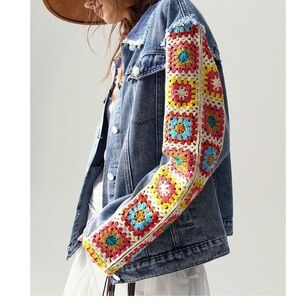 Boho Medium Wash Floral Crochet Sleeve Oversized Jean Jacket