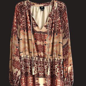 Boho Midi Dress 2X Plus Multicolor Neutral Aztec Floral Vneck Flowy Bohemian EUC