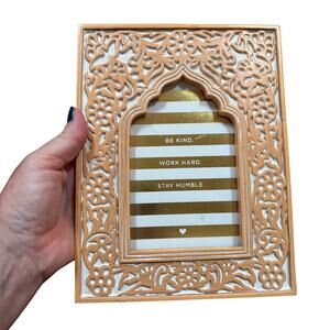 Standing portrait photo frame done in a Boho Moroccan theme - creamy white & terra cotta colored faux stone with ornate carved design. This frame is free-standing / desk top style with the glass cover in place - rear loading and ready to use! Minor wear adds to the ancient stoneware look on this piece. No significant damage - just stunning!