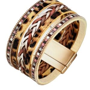 Boho Multi layer leather braided leopard pattern magnetic buckle bracelet.