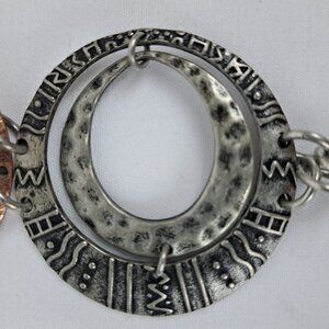 Boho Multi Tone Metal Hoop Chain Belt with Silver, Copper, Brass Tone Double Hoops. Inner hoops feature a hammered look and the outer hoops have a patterned design. Adjustable with the extender chain and lobster claw clasp. Preowned with some normal wear/patina. Please see pictures for approximate measurements- it's about 41 inches in length at the first extender ring including the hook and approximately 50 inches including the hook and the last extender ring. Unbranded listing under vintage. Boho, hippie, Bohemian, Festival, Coachela, Western, Southwestern, Rodeo.