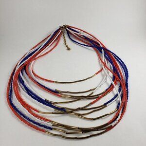 Elevate your outfit with this vibrant and stylish multi-strand beaded necklace! Featuring a mix of red, white, and blue seed beads, accented with gold-tone curved tubes, this statement piece is bold, lightweight, and perfect for layering!