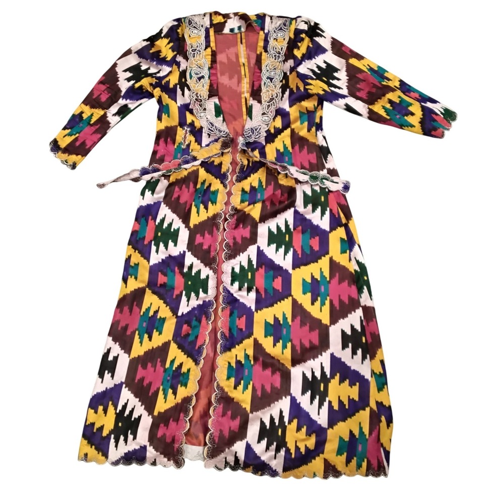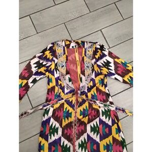 Absolutely stunning handmade-style kimono duster with vibrant geometric ikat print in yellow, purple, fuchsia, green, and white. Detailed with silver embroidered trim and beaded accents along the neckline, edges, and matching waist tie. Lightly lined in a soft reddish-pink fabric for extra comfort and flow.