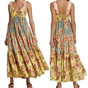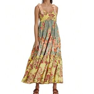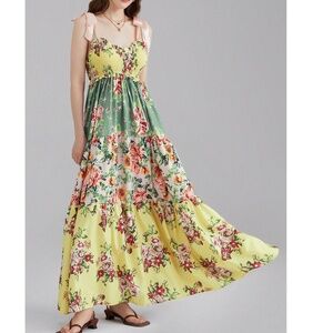 Boho Multicolor Floral Print Shirred Shoulder Tie Ruffle Hem Dress