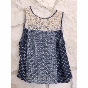 Arizona brand navy and white tank top with cream colored Lace shoulder details. Tags: free people, Boho, flower child, PacSun, lulus, anthropologie, embroidery, music festival, Coachella, bonnaroo, ACL, free press, Aztec, Indian, ethnic, Mayan, Native American, designer, southwestern