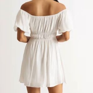 Easy, breezy boho style white dress with off shoulder detail. Perfect for Spring and Summer! A must have little white dress for your closet! NWOT - comes from very clean and smoke free home. Brand new, never been worn. 24 inches long. Ruched waist and puff sleeves.