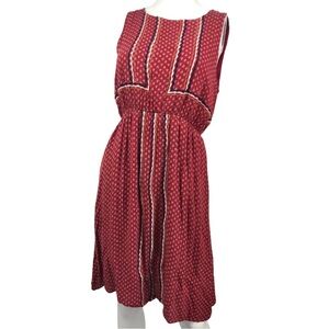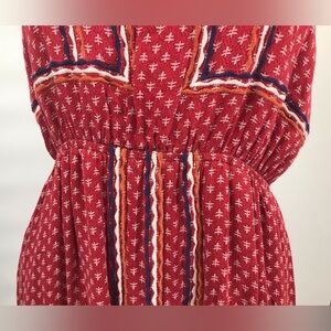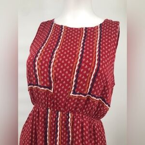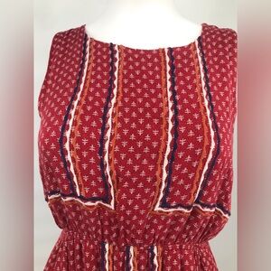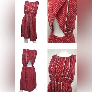 Boho Open Back sleeveless High Neck Dress. Open back is so adorable with crossover detail! Deep red with orange, off white, and navy embroidery lines. Material is very soft! Dress is lined. Elastic waist. Hits at about the knee. Top and skirt areas are meant to be a bit blousy. Layflat Measurements: chest 20”, waist (measured not using stretch) 13.5”, hips 24”, center front length from waist seam is 23”. Size medium