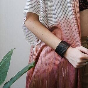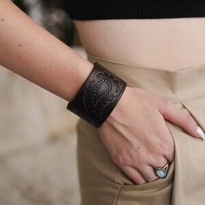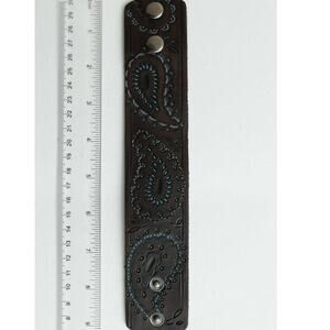 This exquisite bracelet features an intricate paisley pattern pressed into high-quality brown leather, creating a vintage yet timeless look. Perfect for fashion-forward individual, this accessory is a standout piece that adds a touch of bohemian elegance to any ensemble. One Size Fits Most, adjustable snaps
