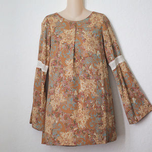 Catch the Boho train in this dress. It's a style emanating free spirit. Teal paisley patterns. Trapeze cut that is not only trendy but timeless. Neutral color which can be worn all year long. Bell sleeves with lace details. Fully lined. Polyester crepe fabric. Bust measurement is armpit to armpit with garment laid flat and doubled. NWOT boutique. Made in USA.