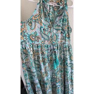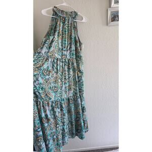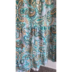 Look fresh and elegant in this bohemian-style maxi dress. Its paisley print in shades of turquoise, gold, and white offers a vibrant and feminine look, perfect for the spring and summer seasons.