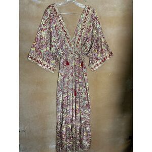 Keywords: maxi dress, boho dress, paisley print, kimono sleeve, v neck dress, tassel detail, beach cover up, resort wear, bohemian style, embroidered dress, mirrored