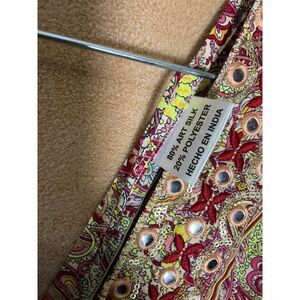 A flowing maxi dress adorned with a vibrant paisley print and kimono sleeves. This elegant piece features a deep V-neckline accented with delicate red tassels and intricate embroidery with mirrored details along the cuffs. The smocked waist creates a flattering silhouette, making it perfect for a beach day, resort wear, or a bohemian-inspired evening out.