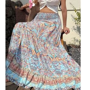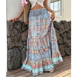 Boho Paisley Print Stretchy High Waisted Ruffle Hem Maxi Skirt
