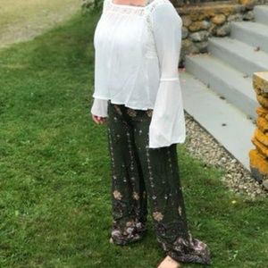 High waist, flowing and super comfortable wide leg pants with a cool floral mandala pattern. Drawstring waists adjusts so you can wear them a little lower on your waist if you choose. These look fantastic paired with a crop top and crochet cardigan. Medium best fits size 6, XL a size 10, but the nature of the high Waist drawstring allows for a little give larger or smaller. Price firm unless bundled.