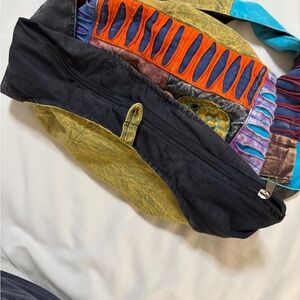 Handcrafted, very colorful boho patchwork shoulder bag. The front has the Om symbol, a peace sign, a spiral, and a flower. The fabric is soft, but the bag feels very sturdy. The strap is long and wide. It has a wooden button closure. There is an interior zipper pocket and the bag also has a zipper closure. It is lined with black fabric which is spotless, so it appeared to have not been used; however, if it was used, it was gently used. Made in Nepal.