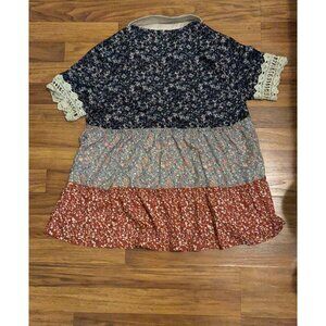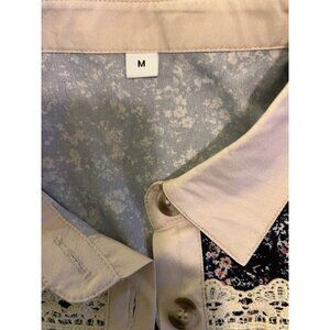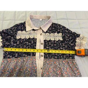 Boho Patchwork Floral Button Down Blouse Medium Crochet Lace Trim Tunic Top Cott