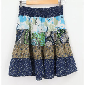 Boho Patchwork Tiered Mini Skirt Cottage Peasant 70s Smocked Waist Floral Size S