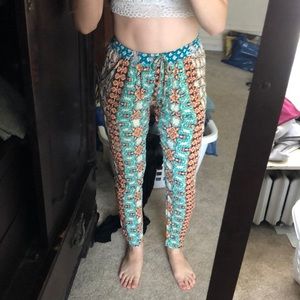 Really cute boho chic pants. Has patterns with orange, beige, teal, and navy blue. They also tie in the front. Size extra small, but could fit a small because of the elastic waist.