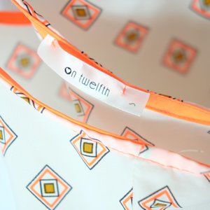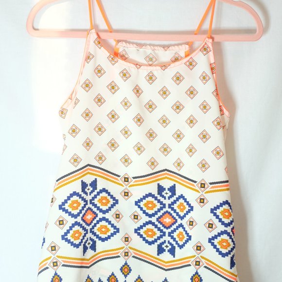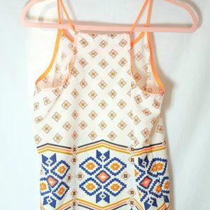 Soft, light, summery boho tank. Fun and bright tangerine accents, with navy and tan details. Wear with ripped jeans or shorts, or even with a blazer! Polyester.