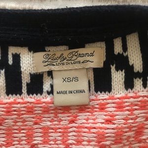 This vest is from Lucky Brand. It is a pink white and navy blue pattern. Super snug! Fabric is cotton blend thick woven