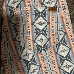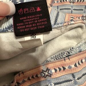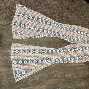 Stylish boho patterned flared pants. Features a mix of blue, pink, and white colors.