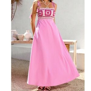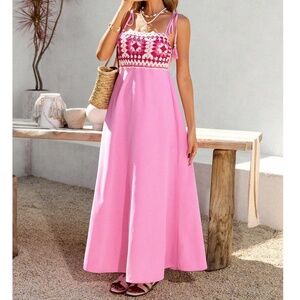 Boho Pink Crochet Shoulder Tie Cami maxi Dress