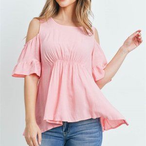 Short frill sleeve cold shoulder round neck gathered front detail top.