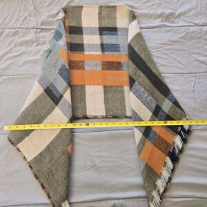 Cozy oversized blanket shawl wrap / poncho scarf featuring a plaid patchwork design in warm fall tones rust orange, sage green, cream, charcoal, and soft blue-gray. Fringe edge, angled ends for versatile styling wear as a scarf, poncho wrap, shoulder throw, or layering piece.