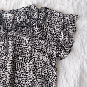 With it's ruffle neckline and hem, flutter sleeves, and dainty polka dot pattern, this Max Studio blouse gives off a romantic and whimsical style. It's relaxed fit and V-neck makes it versatile for casual or workwear.