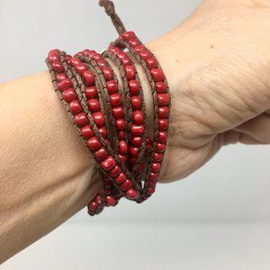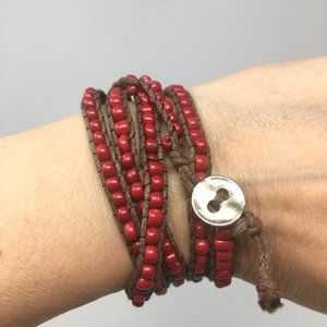 Boho Red Beaded Bracelet Wrapped on Waxed Linen with Silver Toned Button Closure