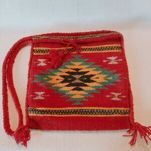 Bright colors and fun motif on this possibly Native American or South American bag. Should strap is about 36" total, so hangs about 18" from shoulder. Cute funky look with your boho wardrobe.