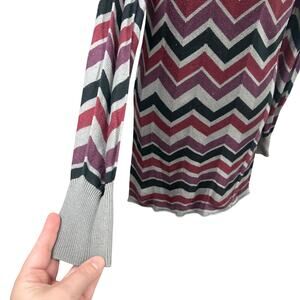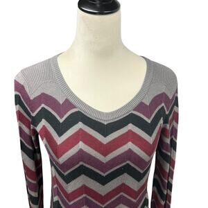 • Design Features: Chevron stripe pattern, ribbed cuffs, scoop neckline, long sleeves, eco-friendly fabric blend