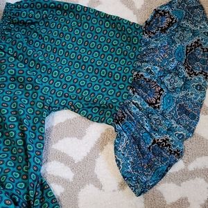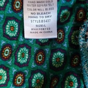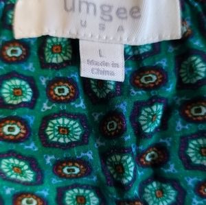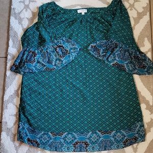 Umgee, Green Print Body with Blue Print along Bottom of Blouse and Along the Bell Sleeves, Elastic Neckline that can be worn on or off the shoulders, 65% Cotton, 35% Polyester, Two Pockets on Sides